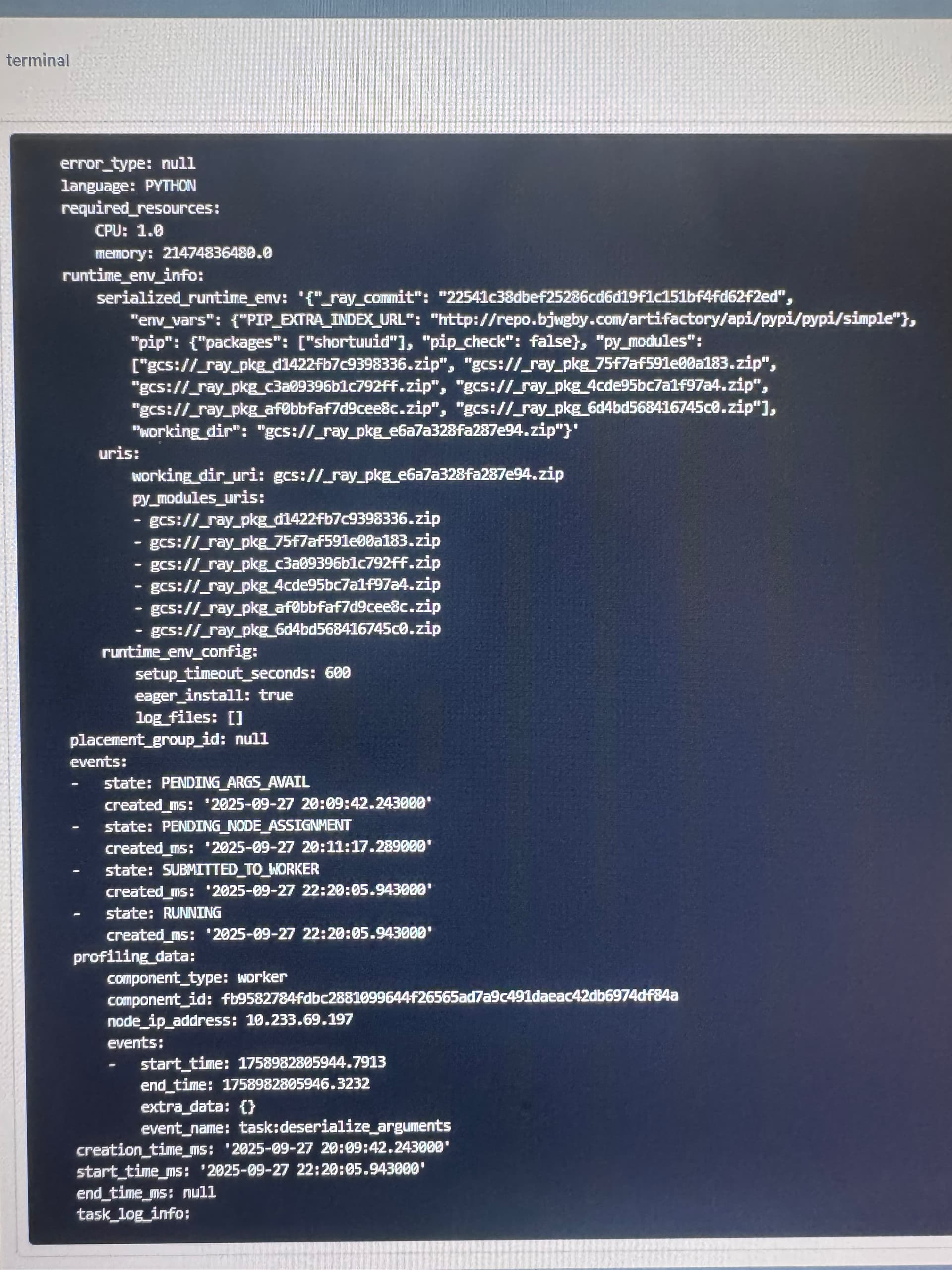 大量的任务都卡在这个状态,开始运行时并发打的比较满,运行一段时间后并发就开始下降了。我这里所有的任务资源设置都是 20Gmemory,1cpu 所以不会出现碎片化导致的无法调度。在并发下降期间,我的cluster node上的 cpu和memory 都是非常充足的,但是资源只是用了10%